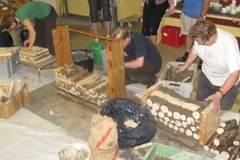 Pölkkysaviseinää muurataan pienessä mittakaavassa sisäkokeina lauantai-iltapäivänä syksyllä 2010