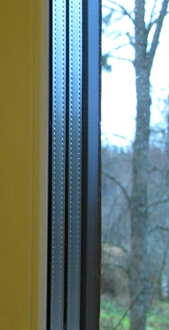 Ekotalossa on luonnonmukainen ilmanvaihto + kylpyhuoneen poisto. Tuloilmaventtiili (kaikkiaan 2 kpl) näkyy kuvassa seinän alaosassa ja 3-4 poistoa on sijoitettu ylös/ulos.