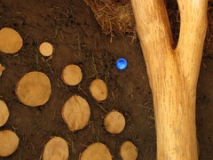 Kokeileva, leikkisä savimökki. Mökin etuseinä oikealla on Cob- tekniikkaa, kuvan etualalla "harvaa" pölkkysaviseinää ja takaseinät ovat savirapatulla olkipaalirakenteella tehtyjä. Viherkatto on aloitettu, mutta valmistuu täydellisesti vasta ensi kesänä, kuten myos mökin sisäpuoli, mukaanlukien savilattia, nukkumisparvi ja lopullinen seinärappaus ja -koristelu.