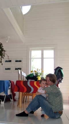 Patricia ja tytär Elsa laajennetun ja peruskorjatun talon edessä. Julkisivusta ei haluttu tehdä perinteisen punavalkoista, joten ikkunanpuitteet maalattiin siniharmaiksi. Nurkat saivat saman värin kuin lautavuoraus. Lisäeristys tehtiin hirsiseinän ulkopinnalle ja samalla ikkunat siirrettiin ulkoseinän tasalle, jotta julkisivun ulkonäkö säilyisi ennallaan. Laajennuksen alla näkyy myös uusi kellariosa, jossa on mm. tekninen tila. Alkuperäiset ikkunat on restauroitu ja uuteen osaan teetettiin ikkunat vanhan mallin mukaan.